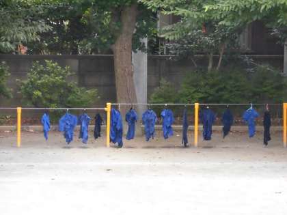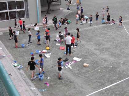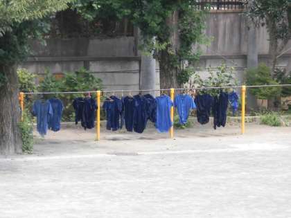 校庭の鉄棒などに干したシャツは、夏の陽ざしに浴びて数時間で乾きました。どれ一つとして同じようには染まらず、それぞれが独自の味わいのある仕上がりになっていました。運動会の晴れの舞台に、全員でこの衣装を着て披露されます。今からとても楽しみですね。