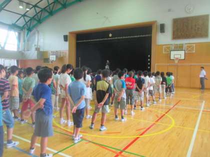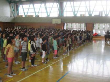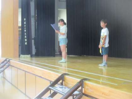 1学期の終業式を無事迎えることができました。校長先生からは、この1学期の生活をしっかりとふり返り、充実した夏休みを過ごすようにとの話がありました。児童代表の言葉は、1年生と5年生の児童が、がんばった1学期の活動をふり返りました。次に全校児童で集まるのは、9月1日の2学期の始業式です。それまで、おのおのが楽しい夏休みを過ごし、そして、またみんな笑顔でこの体育館に集まりましょう。