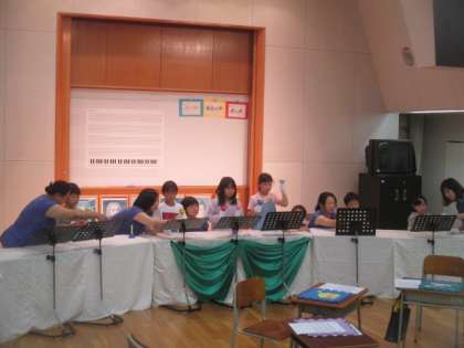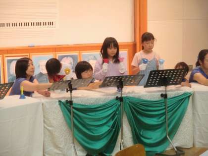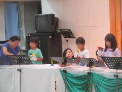 ハンドベルの講座では、およそ1時間の猛特訓の成果を発表しました。6人の子どもたちが力を合わせて、2曲演奏しました。短い時間でよくがんばりました。拍手です。