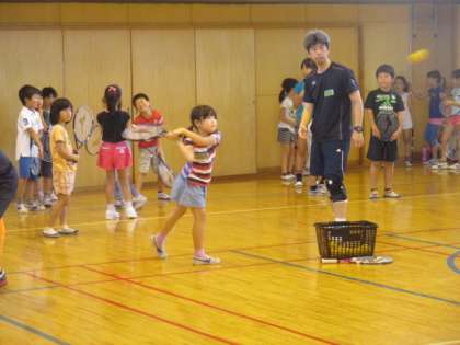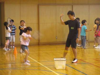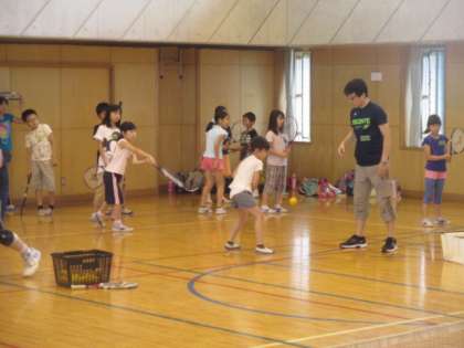 ショートテニスの講座でもまとめに入ります。ショットの練習を繰り返し、連盟の講師の方々がマンツーマンで指導をしてくれました。ラケットを持つ姿も様になってきて、フォームも格好良くなりました。と同時に鋭いショットも増えて、子どもたちの表情もとても満足そうです。