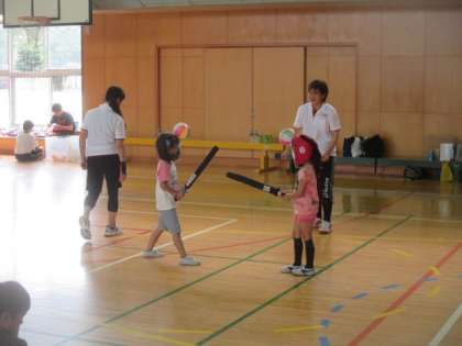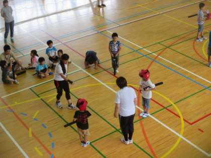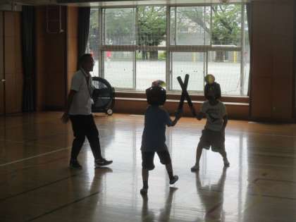 スポーツチャンバラでは、いよいよ対戦が行われました。ルールを守って、顔につけた防具の頭の上の風船を狙います。教わった剣の振り方や足の運びを意識して、友達との対戦を楽しみました。