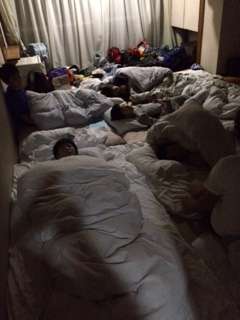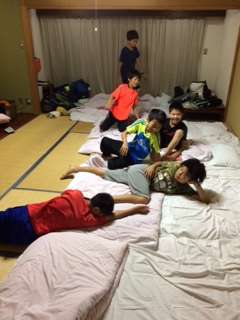 まだ少し興奮気味の子もいるようですが、電気を消して横になります。明日はハイキングがありますので、しっかり休みましょう。おやすみなさい。