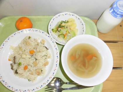 「ピラフ」は、スペインの「パエリア」、イタリアの「リゾット」とともに世界3大米料理と言われています。今日は給食風にアレンジし、お米を牛乳で炊きました。成長期にはカルシウムをたくさん摂ってほしいと思います。