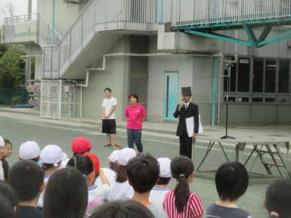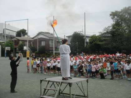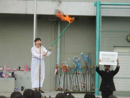 今朝の全校朝会は、ゲストとして近代オリンピックの祖である クーベルタン男爵に扮した石井先生が司会となり、女神さまになった校長先生より、オリンピズムについてのお話がありました。運動会に向けての大切なめあてについて、聖火の炎と共に伝えていただきました。連日、運動会に向けて練習に励んでいる子どもたちは、真剣にお話を聞いていました。