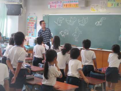 今日は中学年でALTの先生の外国語の授業がありました。エリック先生の動物のイラストに、子どもたちも大笑いでしたが、先生の発音をよく聞いて、楽しくアクティビティーに取り組むことができました。次の授業は10月にあります。