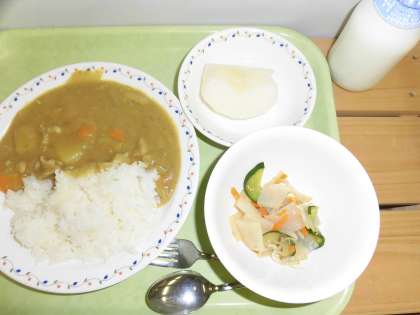 今日のカレーは、初登場の「ココナツチキンカレー」です。鶏肉をヨーグルトで下味をつけ、仕上げにココナツミルクを加えること以外は普段のカレールウと同じです。好き嫌いの分かれる味付けかと心配しましたが、香りも強くなかったので、受け入れてもらえたのではないかと思います。