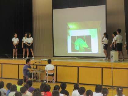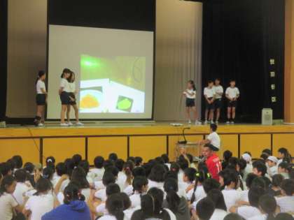2学期最初の児童集会は、「これはどっちでしょう」集会です。スクリーンに登場する2つの写真を見て、当ててほしいものを選ぶ二者択一のクイズです。食べ物や動物など、区別がつけにくい問題に、子どもたちも迷いながら手を挙げていました。集会委員の皆さん、朝から準備ありがとうございます。これからも楽しい集会を企画してください。