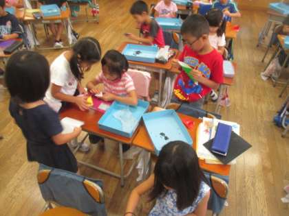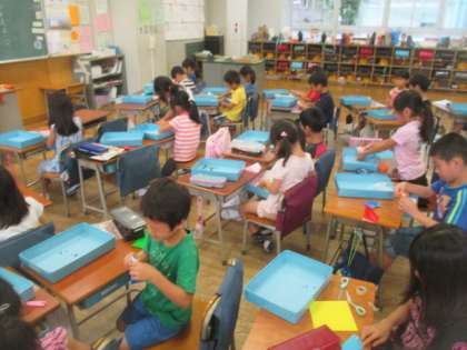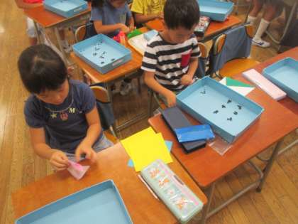 1年2組では、生活科の授業でとれたアサガオの種を数えました。算数で学んだ数の数え方を使い、一粒ずつ丁寧に扱いながら並べます。集めた種を、来年の1年生にプレゼントするために、上手に色紙を折って袋詰めしました。