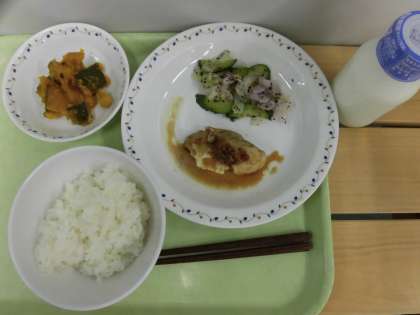 「ごはん、白身魚の変わりソース、南瓜の含め煮、野菜のゆかりかけ、牛乳」です。