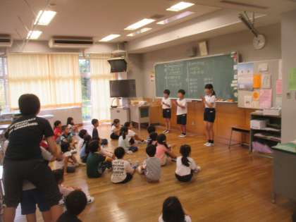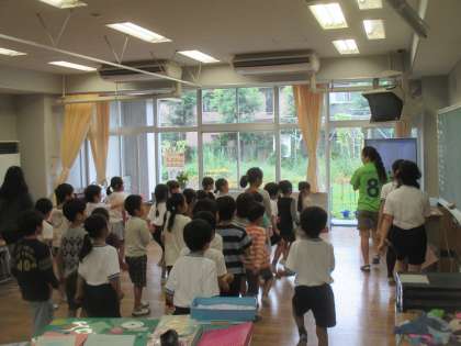 中休みは、低学年の教室に、運動会の全校ダンスの係児童がやってきて、八幡山音頭の指導をしてくれました。1年生は初めて踊るダンスに興味津々で、見よう見まねで踊っていました。係児童の皆さん、休み時間もご苦労様でした。