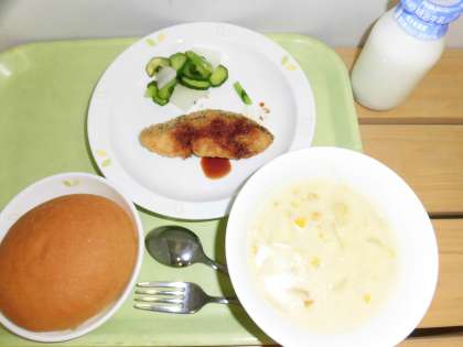 「丸パン、白身魚のフライ、野菜のレモンかけ、クリームスープ、牛乳」です。