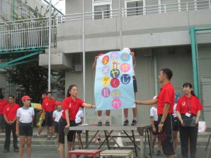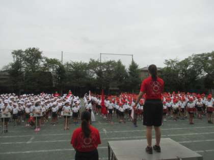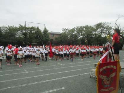 心配された雨もやみ、今朝は校庭で体育朝会と、運動会の全校練習の1回目が行われました。最初に赤白に分かれての整列とスローガンの発表がありました。続いて閉会式の練習が行われ、得点発表や優勝旗・準優勝杯授与など本番同様に練習しました。
