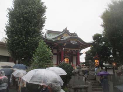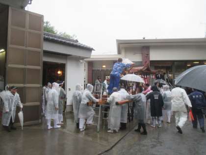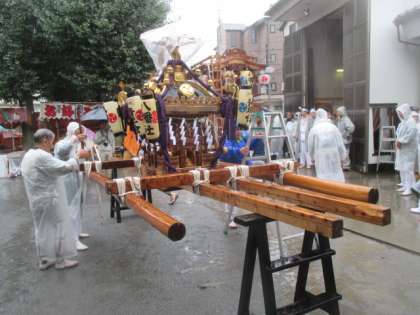 八幡山八幡社の祭礼が始まりました。あいにくの雨ですが、朝早くから境内には、神輿を担ぐ地域の方々や、山車を引く子どもたちが集まり、開始の式典が行われました。