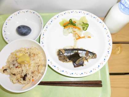 「秋の香りごはん、秋刀魚の松前煮、野菜の甘酢かけ、プルーン、牛乳」です。