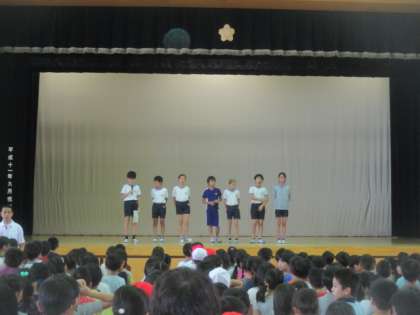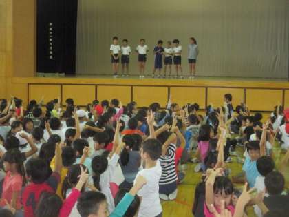 今朝の児童集会は、この世の中にある世界一のものを二者択一で答える、題して『世界一集会』。集会委員の児童が出す問題を聞いて、子どもたちは「1」か「2」の指で示して答えます。世界一高い山やオリンピックの問題など、さまざまなジャンルの出題に、大盛り上がりでした。楽しいひとときになりました。集会委員の皆さん、ご苦労様でした。