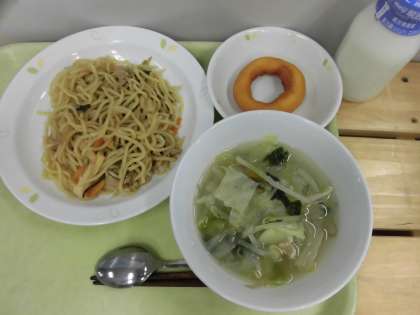 「塩焼きそば、ベーコンと野菜のスープ、米粉のポテトドーナツ、牛乳」です。