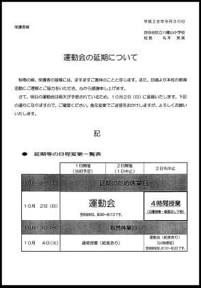 明日10月1日(土)は、朝から雨が断続的に降り続けるという予報のため中止とし、明後日の10月2日(日)に延期させていただくこととなりました。大変急な変更でご迷惑をおかけしますが、よろしくお願いいたします。