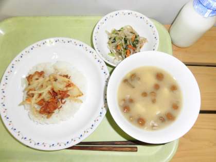 今日の味噌汁の具は、なめこ、豆腐、長葱でした。給食では使うことの少ない「なめこ」は、漢字で滑らかな子(滑子)と書きます。表面のぬるぬるは、納豆や山芋と同じ「ムチン」という栄養素を含んでいるので、保湿効果が期待できるようです。