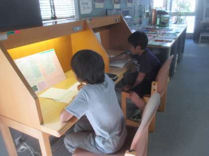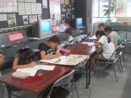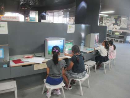 郷土資料室には、DVDや模型、パンフレットなどのさまざまな資料が用意されていて、子どもたちは必要に応じて移動し、教材に当たりながら自分の課題を調べていました。およそ1時間、集中して取り組むことができました。
