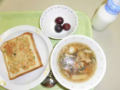 「ツナトースト、春雨スープ、巨峰、牛乳」です。