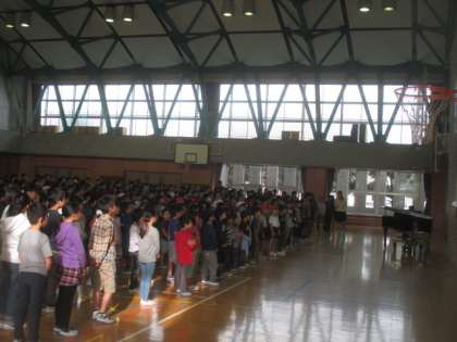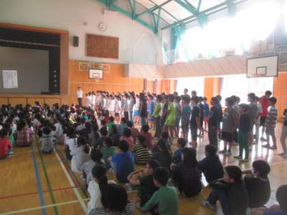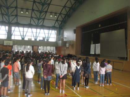 1ヶ月に一度の音楽朝会が、体育館で行われました。季節はすっかり秋ということで、課題曲は「もみじ」です。高学年がお手本で歌ってみせてくれて、最後に全員で歌いました。木々の紅葉も進みますので、そんなしみじみと秋を感じながら、これからも歌っていきたい曲ですね。