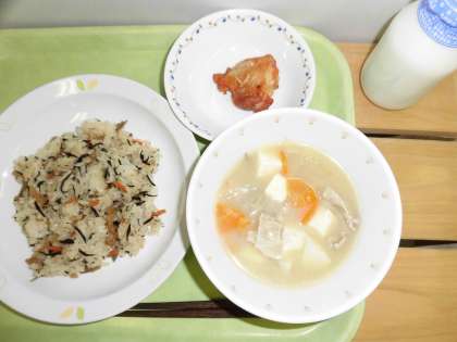 「ひじきごはん、鶏肉の南蛮焼き、粕汁、牛乳」です。