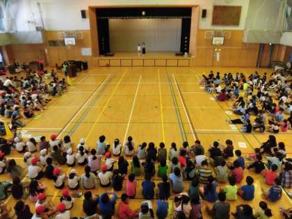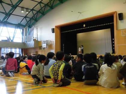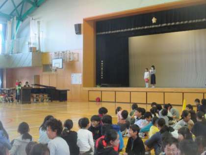 全校ゲームは、八幡山小にちなんだクイズから。八幡山小の歴史から、児童数・学級数など、いろいろな問題が出題されました。