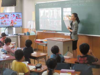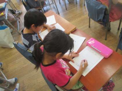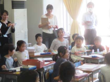 友だちと楽しく交流した後は、楽しかったこと、工夫したこと、友だちのよいところをワークシートに書いて発表します。しっかり遊べて、友だちとのやりとりも楽しかったようで、ワークシートにはびっしりとふり返りができていました。感想を発表したい子もたくさんいて、子どもたちが1時間充実していたことが分かる授業でした。