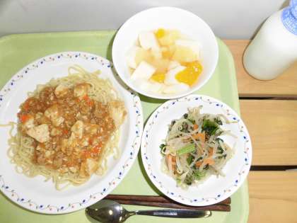 「麻婆豆腐焼きそば、ナムル、杏仁豆腐、牛乳」です。