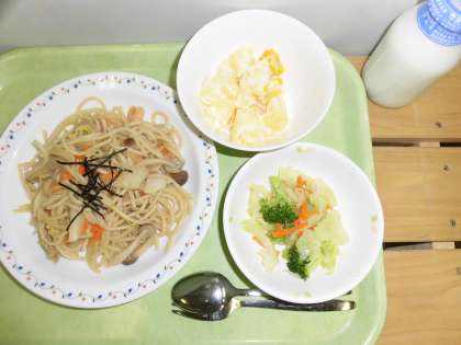 「和風スパゲティ、ブロッコリーのサラダ、フルーツヨーグルト、牛乳」です。