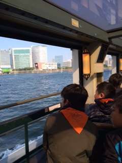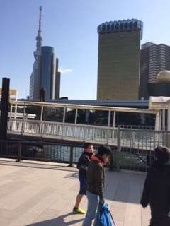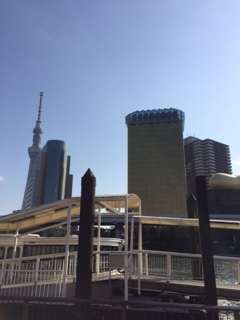 水上バスが吾妻橋に到着しました。スカイツリーが間近に見えます。