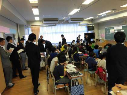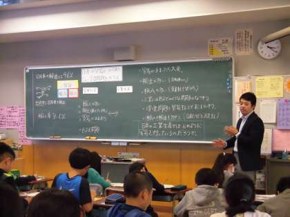 5年2組では、本日の6校時、世小研の社会科部の研究授業が行われ、区内からたくさんの先生方が来校し、担任の畑中主任教諭の授業を参観していただきました。本時は「世界とつながる日本の工業」の単元の導入で、日本の自動車工業の輸出入の様子を調べ、日本の工業生産における貿易について関心をもち、学習課題を立てることがねらいの授業でした。提示された資料をもとに、日本の自動車産業の特徴をとらえて課題をつかみます。ICTを活用しながら、子どもたちの話し合いを大事にした活気のある授業でした。授業後は、講師としてご来校いただいた教育指導課の栗林先生からご指導をいただき、参観していただいた先生方からも忌憚のない意見をいただきました。本日はお忙しい中、誠にありがとうございました。