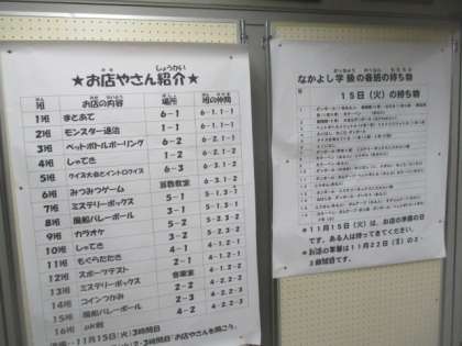 来週15日(火)に行われる「なかよし学級」で話し合われる、お店屋さんについての掲示が、1階の昇降口に貼り出されました。どの学年の児童も、自分の班で何を行うかをよく見ておいてくださいね。