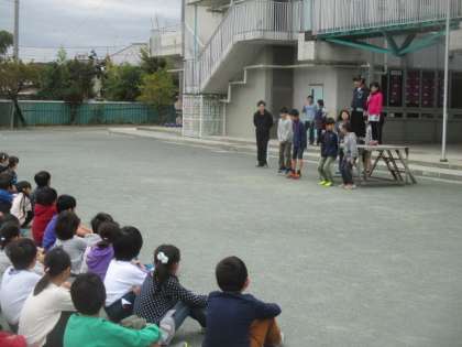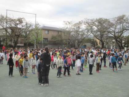 今朝の児童集会は、「言うこと○○、やること○○集会」。集会委員の指示に従って、全校児童が同じ動きをするという活動です。最初は、「言うこと一緒、やること一緒」の号令で、同じ動きをしました。次に「言うこと一緒、やること反対」の号令では、「左」と言ったら、左と言いながら、右に移動します。さらに難しくなり、「言うこと反対、やること一緒」、最後に「言うこと反対、やること反対」の号令になり、子どもたちは大騒ぎしながら、間違えても楽しそうに動いていました。今年一番の寒さになりましたが、全校で盛り上がって、身体も温まる楽しい活動になりました。集会委員の皆さん、楽しい企画をありがとうございました。次の集会も楽しみにしています。