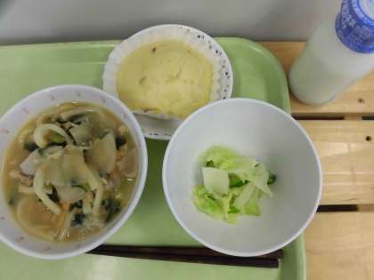 今日の給食には10種類の野菜を使いました。今が旬の里芋をはじめ、根菜類、葉菜類、果菜類とバラエティーに富んだ10種類です。1人分は平均150グラムですので、目標の350グラムとの差(200グラム)は、家庭で補っていただけると、今日の野菜はクリアです。