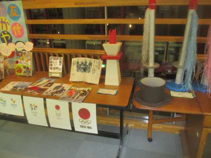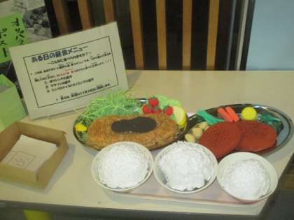 その他にも、ある日のアスリートの食事のメニューも展示されています。食事の標本は、シンクロナイズドスイミングの選手の食事の量を視覚的に訴えています。ハードな練習を乗り切るために、たくさん食べないといけないのですね。それにしても、すごい量です。明日から学校公開期間が始まりますので、ぜひご来校の際にはご覧になってください。