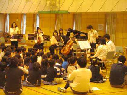 明日の学校公開期間初日は、毎年恒例の「ようこそ先輩コンサート」が開催されます。2回の公演で行われますが、1回目は1〜3年生を対象に、10:00〜10:45に行われます。2回目は4〜6年生を対象に、11:00〜11:45になります。場所は、2階の第二体育館です。今日は、演奏者の方々が音楽室に集合し、夜遅くまでリハーサルを行っています。プロの演奏家の方々の生演奏を間近に聴けるまたとない機会ですので、ぜひご参観いただきたいと思います。(※ 写真は、昨年度の演奏の様子です。)