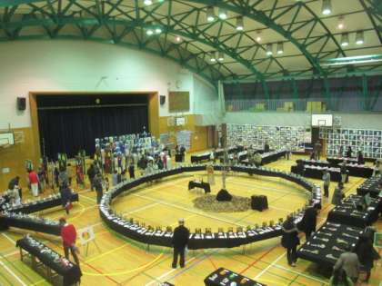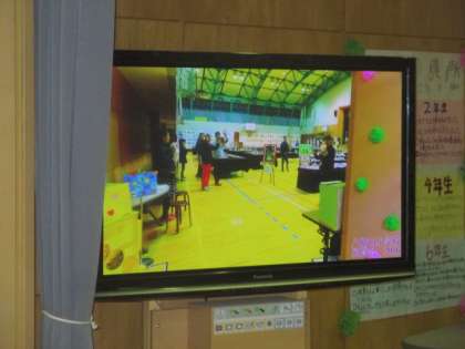 前日金曜日の夕方に、本校保護者のご協力をいただき、体育館上空から展覧会の様子を撮影した映像が、会場入り口で放映されました。入場された皆さんも、興味深く映像を見ておられました。展覧会を盛り上げる大変素晴らしい演出になりました。素敵な企画をご提案いただき、さらに翌日に間に合うように映像編集までしていただきまして、本当にありがとうございました。