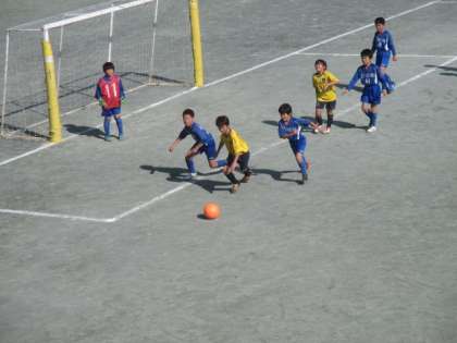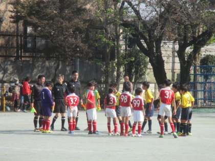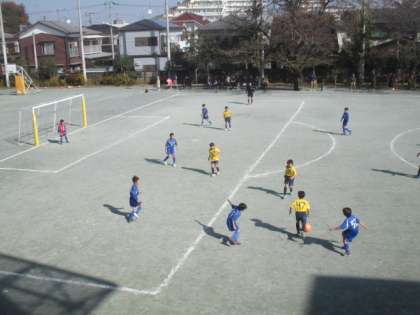 日曜日の校庭では、八幡山FCの子どもたちが、千歳台小と松原小のチームを招聘しての練習試合を行っていました。冬晴れの爽やかな青空の下、懸命にボールを追いかける選手の姿に、観戦している保護者からも熱い声援が響いていました。