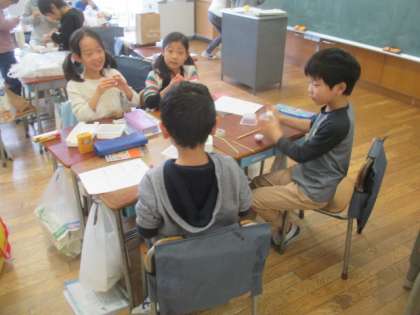 2年3組では、生活科の授業「作ってためして」で、おもちゃ作りをしました。前時に作った設計図をもとに、友だちと協力しながら取り組み、できあがったおもちゃをいろいろと試して修正を加えました。みんな意欲的に取り組んでいました。