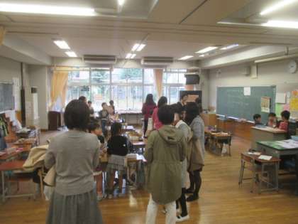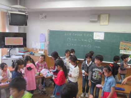 1年生が学年合同で、生活科の「ようこそたからものランドへ」の授業を行いました。「あきとともだちになろう」の学習で作ったおもちゃを使って、グループでブースを作って交代で紹介し合い、参観した保護者の皆さんにも披露しました。とても活気のある活動になりました。終了後の片付けも、自分たちでしっかりできました。