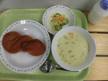 クラムチャウダーは、玉葱(グルタミン酸)、鶏ガラや鶏肉(イノシン酸)とあさり(コハク酸)の旨味成分の相乗効果でこくのある味に仕上がりました。いつもとひと味違う揚げパンとサラダとともに、今日もよく食べてくれました。