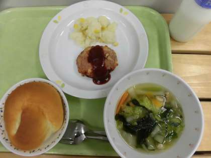 「ミルクパン、アップルチーズハンバーグ、コーンポテト、白菜のスープ、牛乳」です。