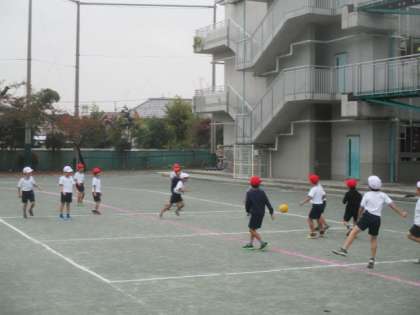 1年2組では、2時間目に体育でドッジボールをやりました。準備運動をしてから、赤白に分かれてゲームをしました。男女ともとてもエキサイトして、ボールを追いかけたり、よけたりして活動を楽しんでいました。ちょっと肌寒い1日でしたが、とても元気に取り組む姿が見られました。