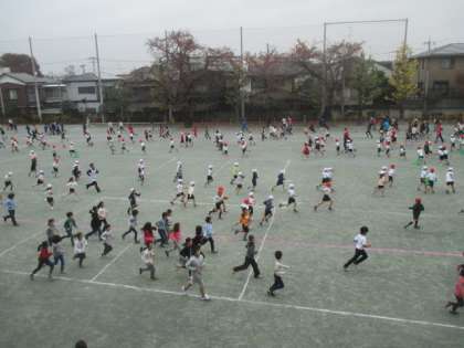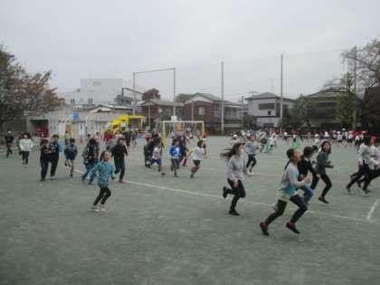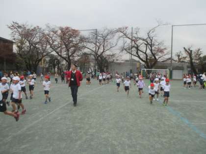 B時程でない日の中休みは、全校児童でランランランニングです。校庭を決まった時間、みんなで走ります。子どもたちも先生方も、音楽に合わせて、自分のペースをつかみながら楽しそうに走っていました。継続的に走り続け、寒さに負けない体力をつけていきましょうね。