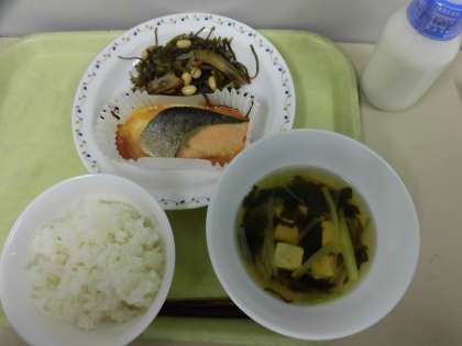 「ごはん、鮭の味噌マヨネーズ焼き、刻み昆布の五目煮、すまし汁、牛乳」です。