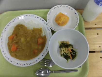 「カレーライス、和風サラダ、柿、牛乳」です。