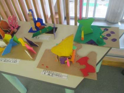 2階のフロアに、5年生が製作した木工の作品が展示してあります。色鮮やかな彩色が施されていて、どれもユニークな造形が目を引きます。展覧会が終わっても、意欲的に創作活動は続けられています。
