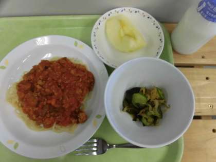 「スパゲティミートソース、じゃこサラダ、りんご、牛乳」です。