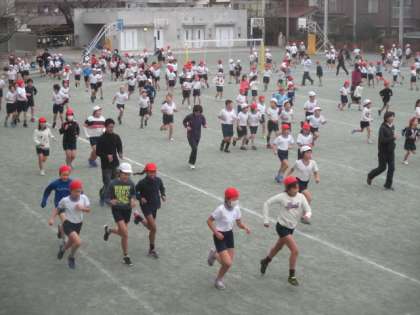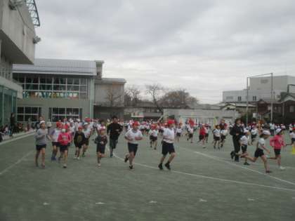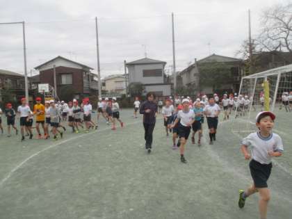テンポのよい音楽になり、いよいよ走り出します。学年によって走る周回コースが違いますが、どの子も自分のペースを守って走ります。先生たちもいっしょにがんばりました。